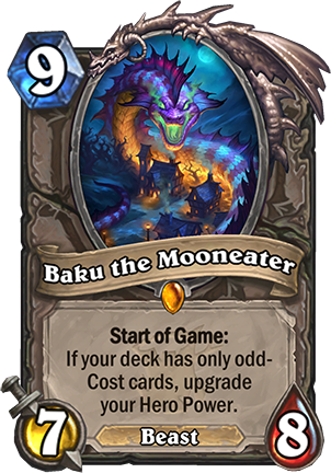 Baku the Mooneater – The mirror image of Greymane is Baku, which upgrades your Hero Power from the very start by building a deck of only odd-cost cards. These upgraded powers will presumably be similar to the ones introduced by Justicar Truehart, which rotated out of Standard a long time ago. Greymane’s cost-reduction will likely make its limitations easier to deal with, but having an upgraded Hero Power from the very start of the game could see you through.